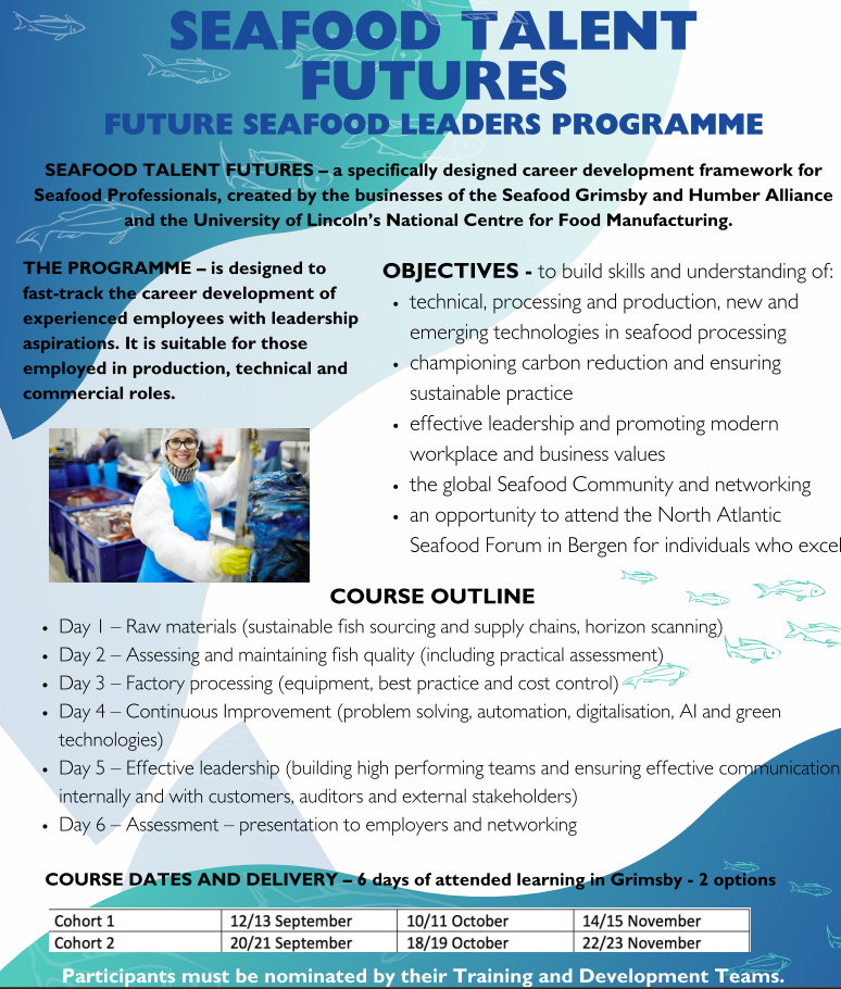 The programme is specifically designed career development framework for Seafood Professionals, created by the businesses of the Seafood Grimsby and Humber Alliance and the University of Lincoln’s National Centre for Food Manufacturing (NCFM). The programme’s first programme, the Future Seafood Leaders course, is the first of its type in the UK. The course, which has been developed by NCFM in collaboration with representatives from the leading seafood processing businesses, Young’s Seafoods, Hilton Seafoods, New England Seafoods and Regal Fish along with Seafox Management Consultants, is designed to fast-track the career development of existing and aspiring leaders in the seafood processing sector.